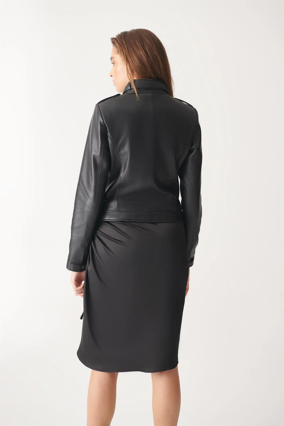 Women biker Leather Jacket crafted with premium lambskin leather with silk lining. Relaxed fit and cool button & zipper detailing. The coolest leather jacket for all seasons.