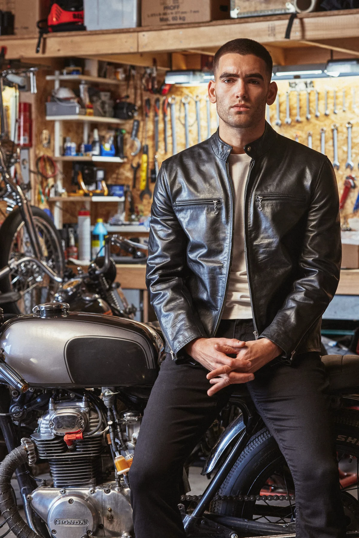 The Cafe racer jacket typically has a simple design with a form and cut, making it one of the most admirable caf? racer jackets ever invented. It also has two zipped chest pockets with Talon zippers and full-piece panels; these features allow for a sleek appearance when the jacket is worn.
