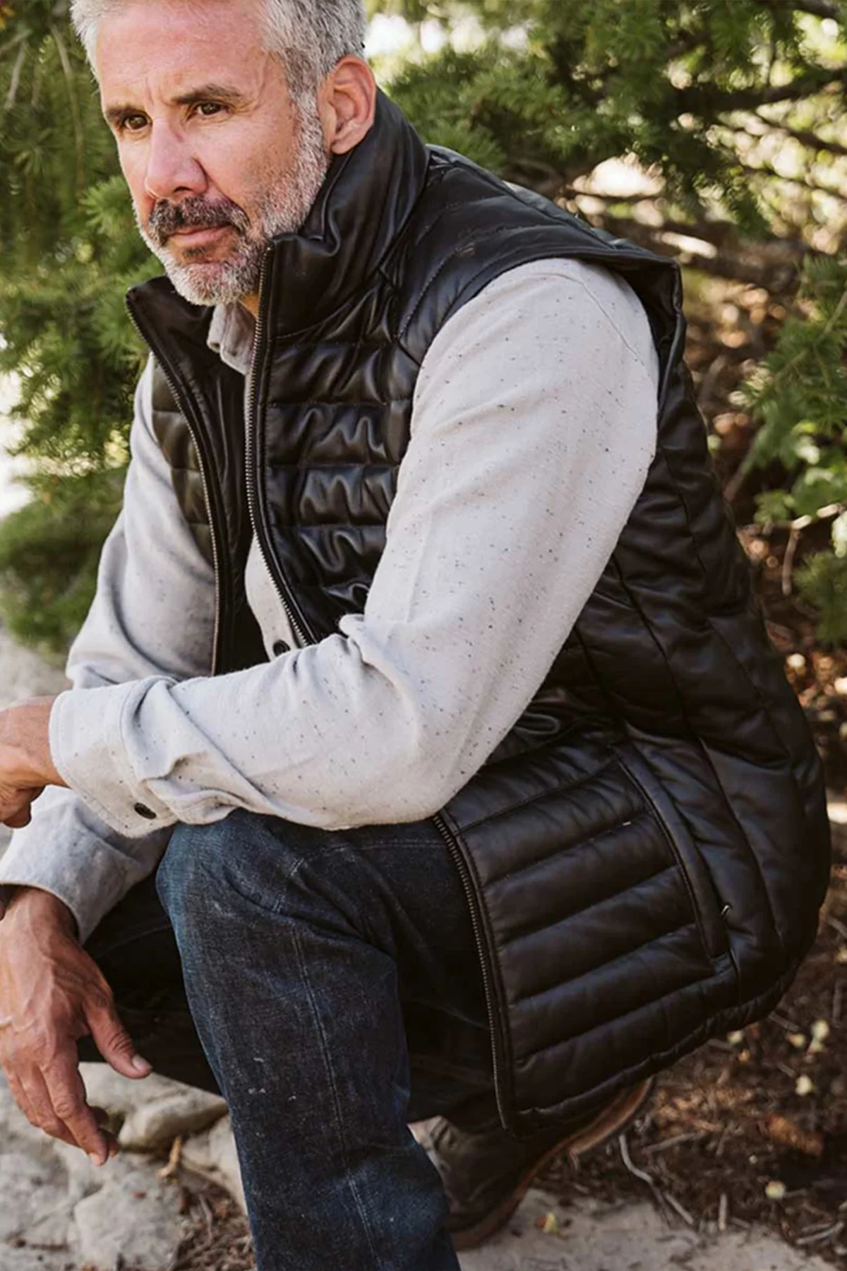 High-end without being flashy, the ruggedness of this leather down vest includes details like an interior left-side chest pocket and antique brass finishing on the zipper front closure and zippered hand pockets. The 100% genuine lambskin leather feels as good as it looks, and the down insulation provides the warmth you need along with durable 100% polyester lining. This leather puffer gilet is crafted with a slimmer fit, so you’ll likely want to size up. Check the sizing guide to be sure.