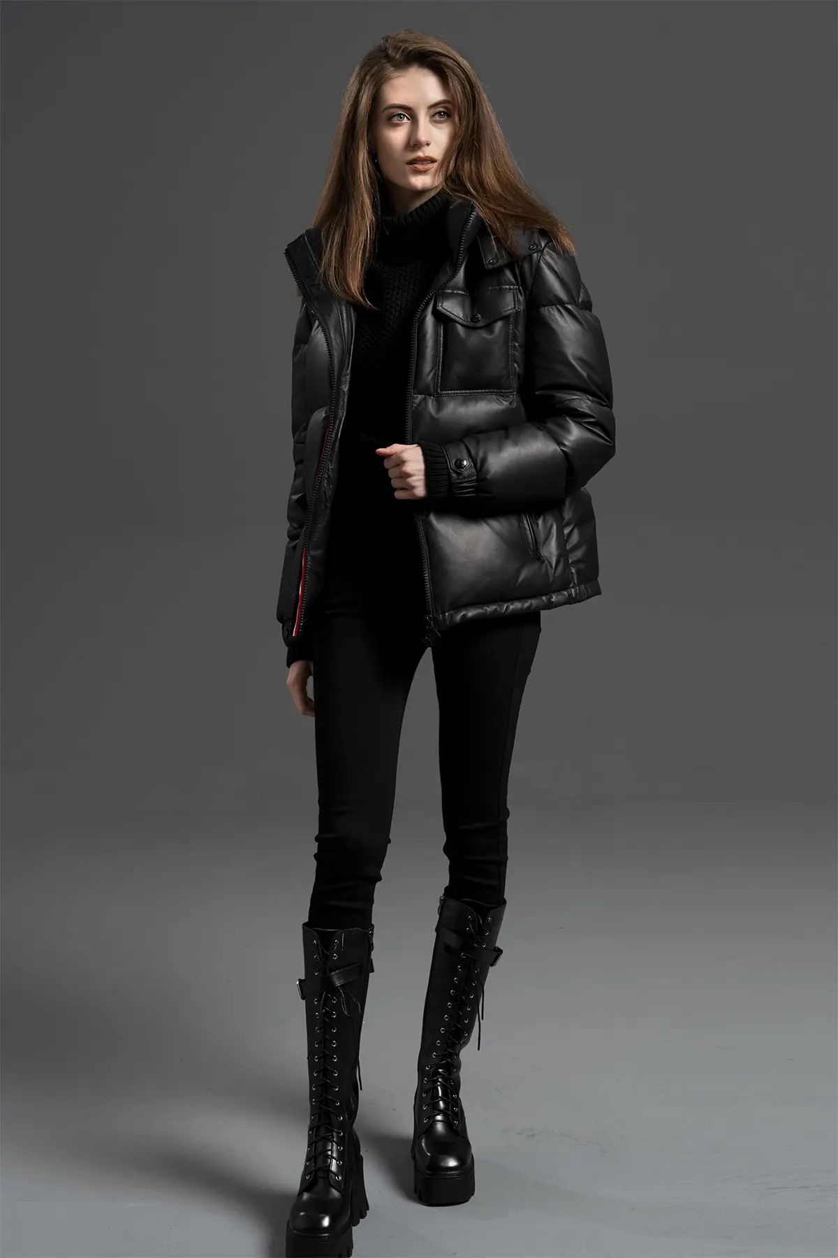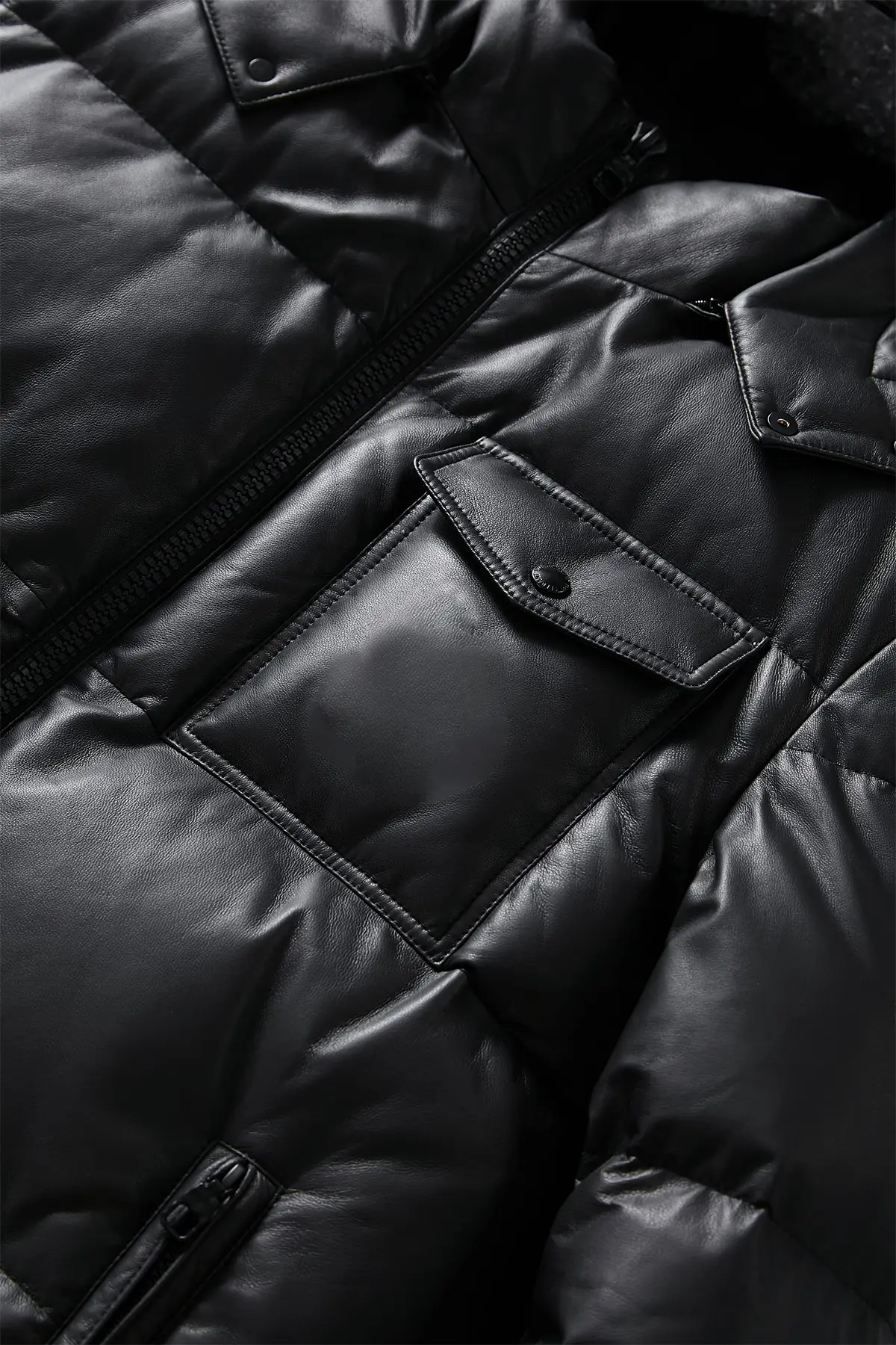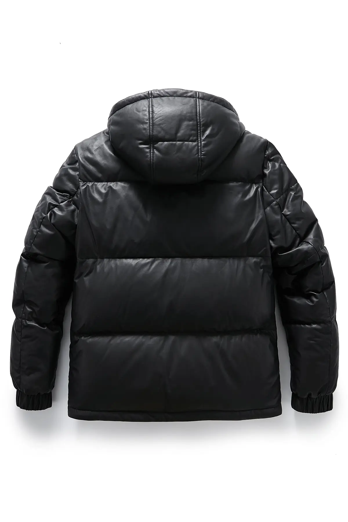 Leather Puffer Jacket with Detachable Hood – Black