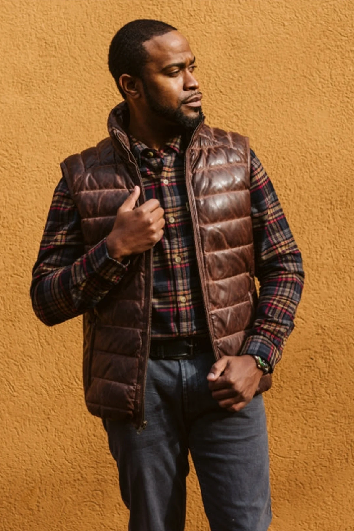 High-end without being flashy, the ruggedness of this Leather Puffer Vest includes details like an interior left-side chest pocket and antique brass finishing on the zipper front closure and zippered hand pockets. The 100% genuine lambskin leather feels as good as it looks, and the down insulation provides the warmth you need along with durable 100% polyester lining. This leather puffer vest is crafted with a slimmer fit, so you’ll likely want to size up. Check the sizing guide to be sure.