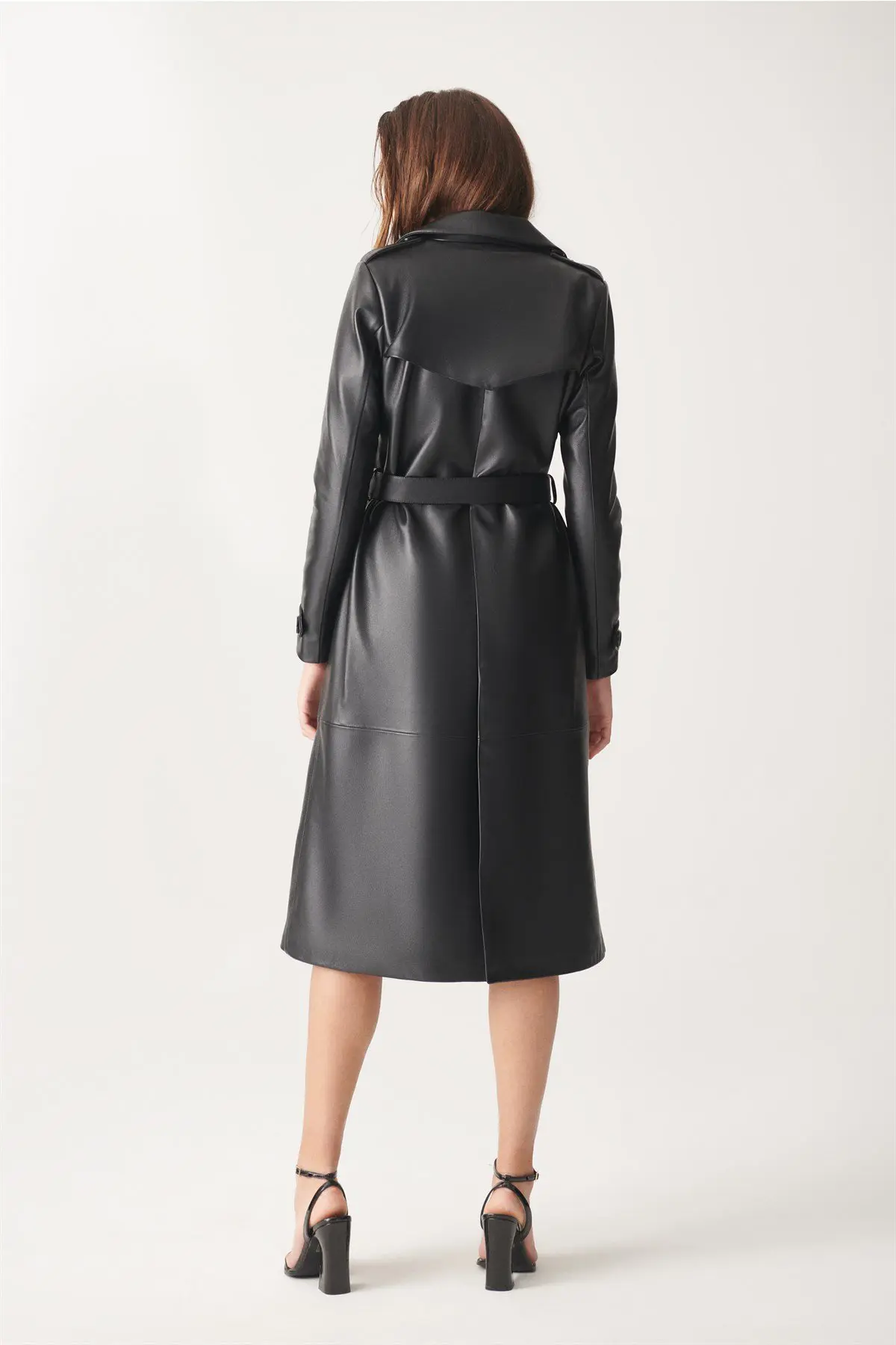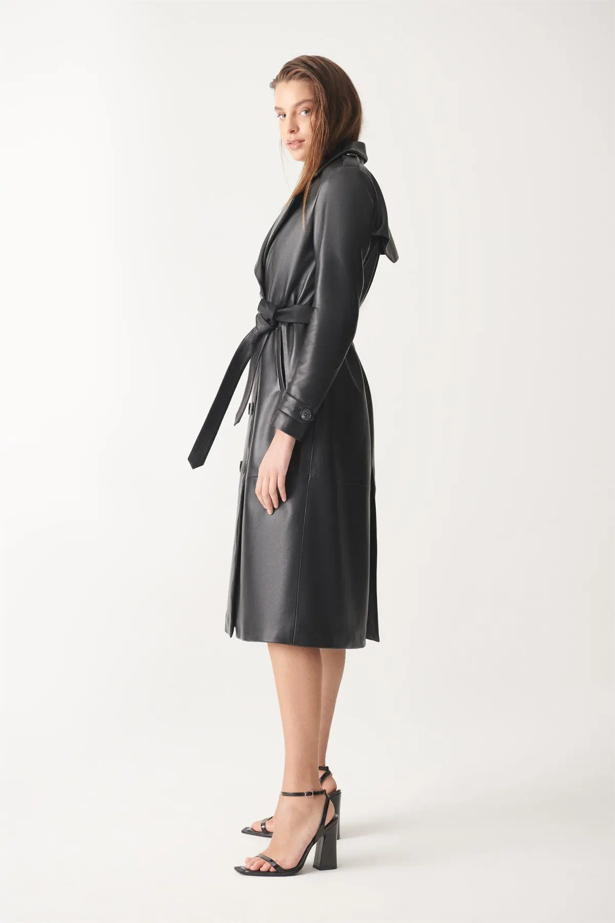 The JESICA Leather Trench Coat Luxury Edition in exudes elegance, making it the perfect fusion of fashion and function. Features include adjustable cuffs, Double Breasted Closure Adjustable Belted Waist and Knee-Length Cut?pockets for added convenience. Experience the ultimate blend of performance and luxury with this must-have addition to your all seasons wardrobe.