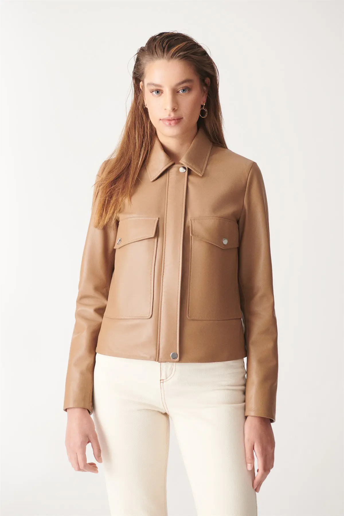Women soft Leather Jacket crafted with premium lambskin leather with silk lining. Relaxed fit and cool button & zipper detailing. The coolest leather jacket for all seasons.